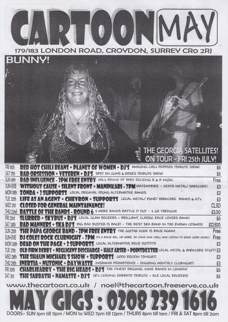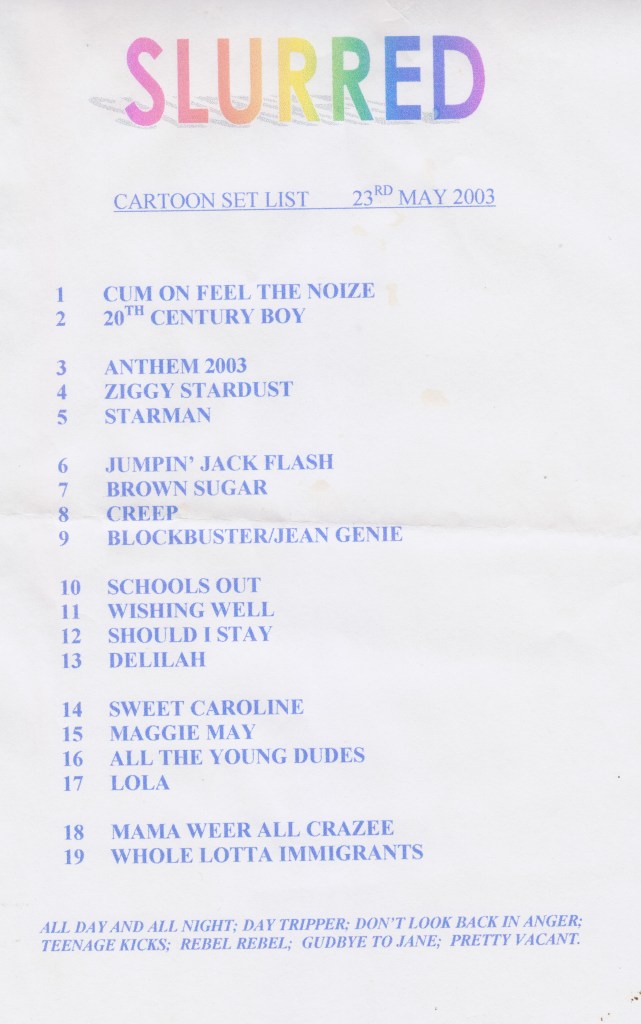 Our 2003 appearance at Croydon’s legendary Cartoon Club banished the memory of our last appearance there in 1992, as Gaia, which finished with the famous heckle “Don’t give up the day job!”.
